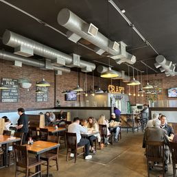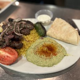 Walking up it was hard to tell if we were going in the right way. There is just an order counter inside the door. I think you could also enter through the bar side. We waited for a moment while someone got a to go order, and then were seated. We sat on the patio with our dog, which was nice. Our server came up quickly to grab some drinks. Their drink list was not up to date though, as he had to come back and tell us that both beers were out. It was good though that it was happy hour and beers were discounted. It would be great if they would out the HH specials on their website. We ordered the hummus combo. It came out with the cilantro jalapeno hummus and baba ganoush instead of 2 hummus dishes. Our server quickly ran back and apologized. He offers to get us the other hummus, but we were good trying the baba. Both the hummus and baba were really good. Hummus was creamy and flavorful. He came back again to make sure we liked the baba, which we appreciated. For food I got the Mediterranean bowl with chicken shawarma. The portion size was great. The salad was tasty and chicken had a perfect amount of seasoning and was tender. I kind of wish it came with tzatziki or garlic sauce also, but it was still really good. Overall had a couple minor issues, but they handled it well. Food was good and our server was very nice, so I would return if back in Visalia. Downtown Visalia has a lot of burgers and bar food, so this was a welcome change.